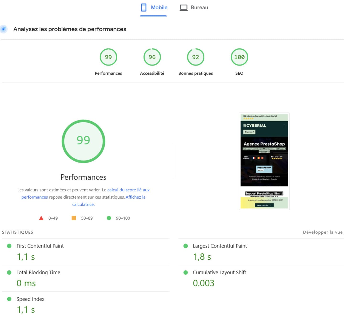 Donc, il est essentiel de noter que le score mobile est celui qui compte pour votre SEO. Si vous avez 95/100 sur ordinateur mais 40/100 sur mobile, Google considèrera que votre site est lent.