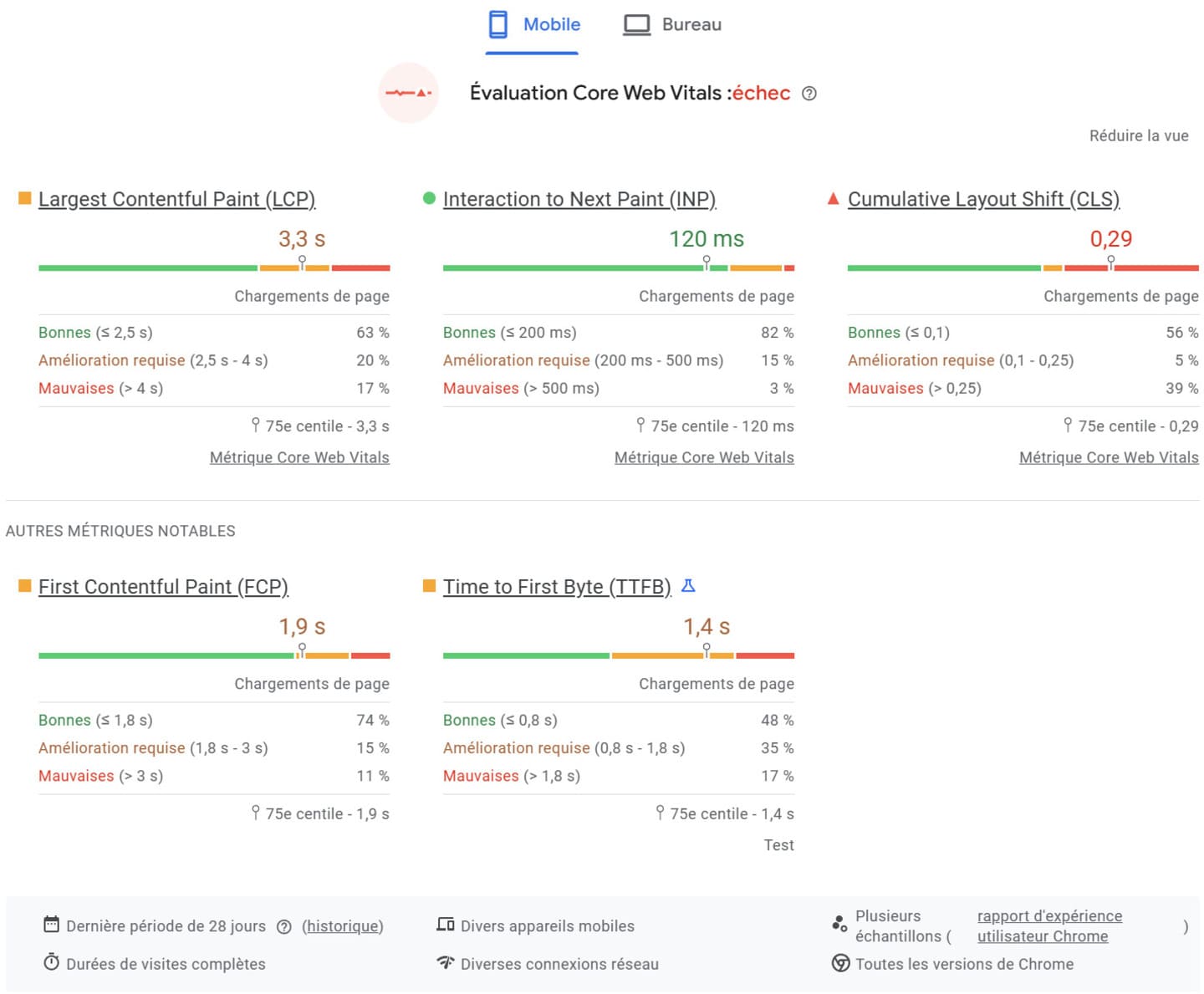 L’analyse se base sur Chrome User Experience Report (CrUX). Ce sont les données réelles récoltées auprès des utilisateurs de Chrome et qui ont visité votre site durant les 28 derniers jours.