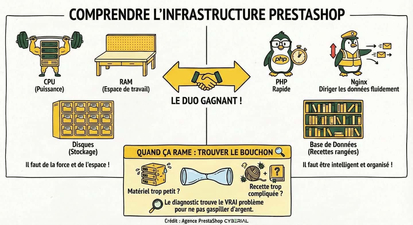 Pour PrestaShop, un matériel trop faible rendra le site lent même avec une bonne configuration, mais un serveur puissant mal configuré sera aussi limité. La meilleure approche est de dimensionner correctement CPU/RAM/SSD et d’optimiser soigneusement PHP, le serveur web et MySQL, en surveillant où se situe réellement le goulot d’étranglement (BDD, code ou module).